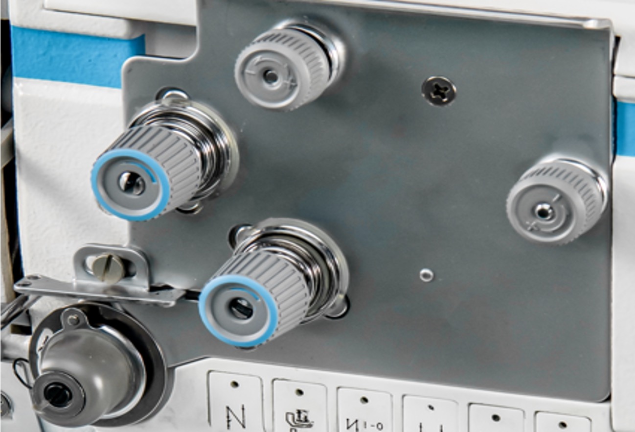 Equipped with two adjustable knobs, this system allows the operator to set and switch between two alternating sewing feet. The feet can be activated automatically—based on material thickness or overlap detected—or manually, ensuring precise feeding and consistent stitch quality on varied fabrics.