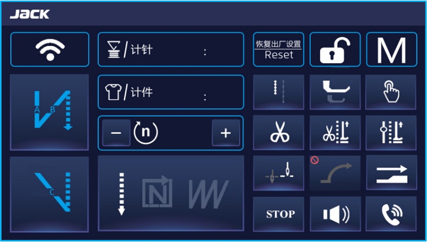 The intuitive touch screen panel uses voice guidance and clear icons to quickly and easily activate or deactivate functions such as bartack, presser foot lifter, thread trimmer, and more. Long-pressing a button provides access to the function settings interface for advanced configuration and customization.